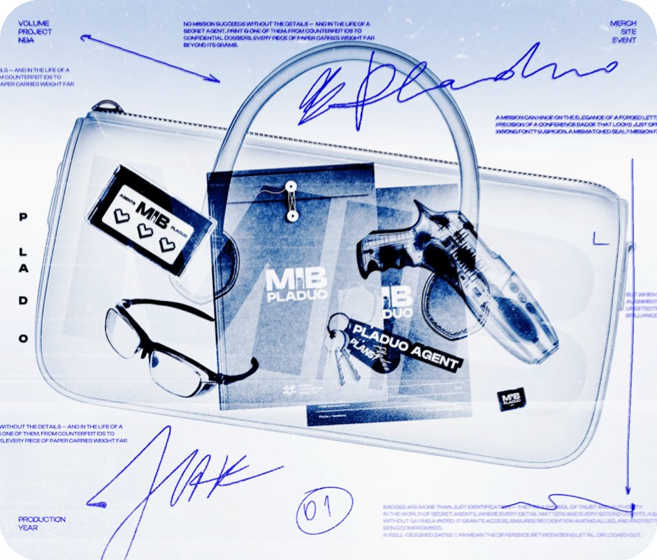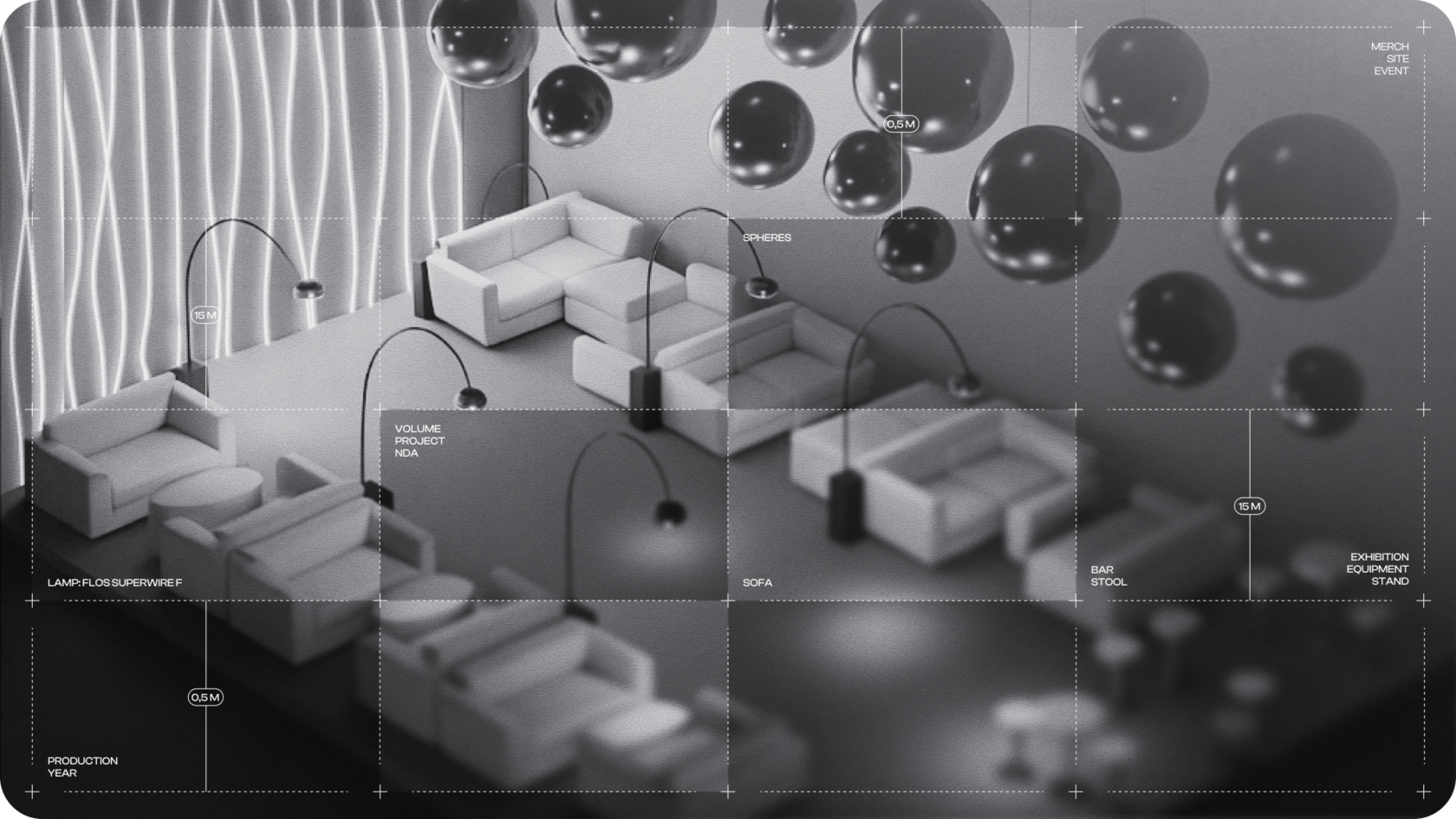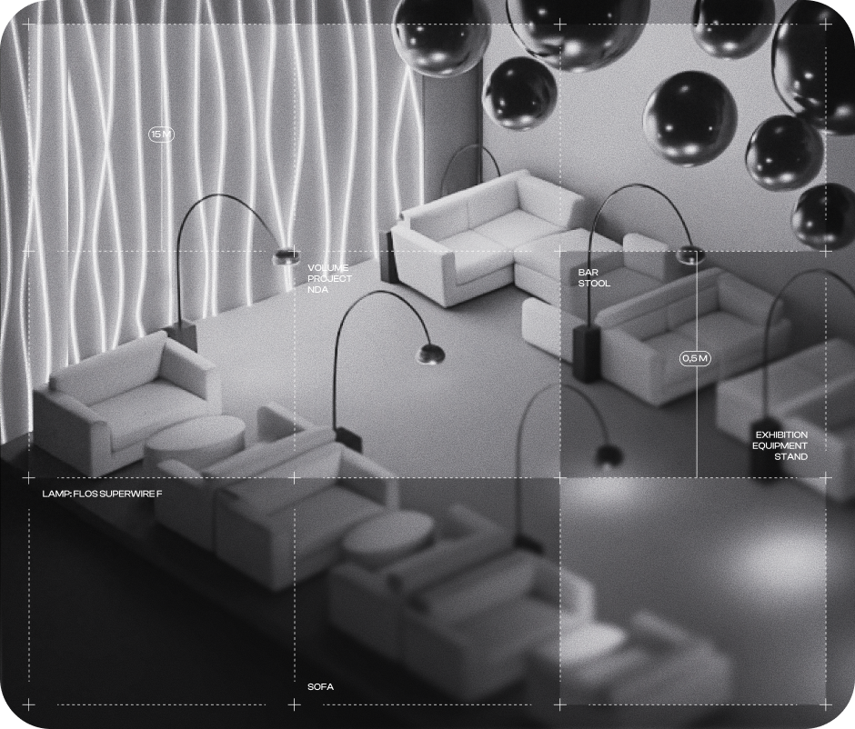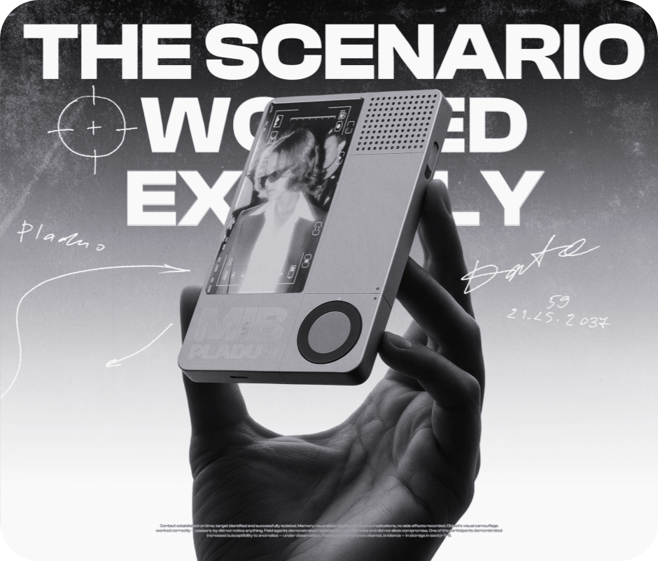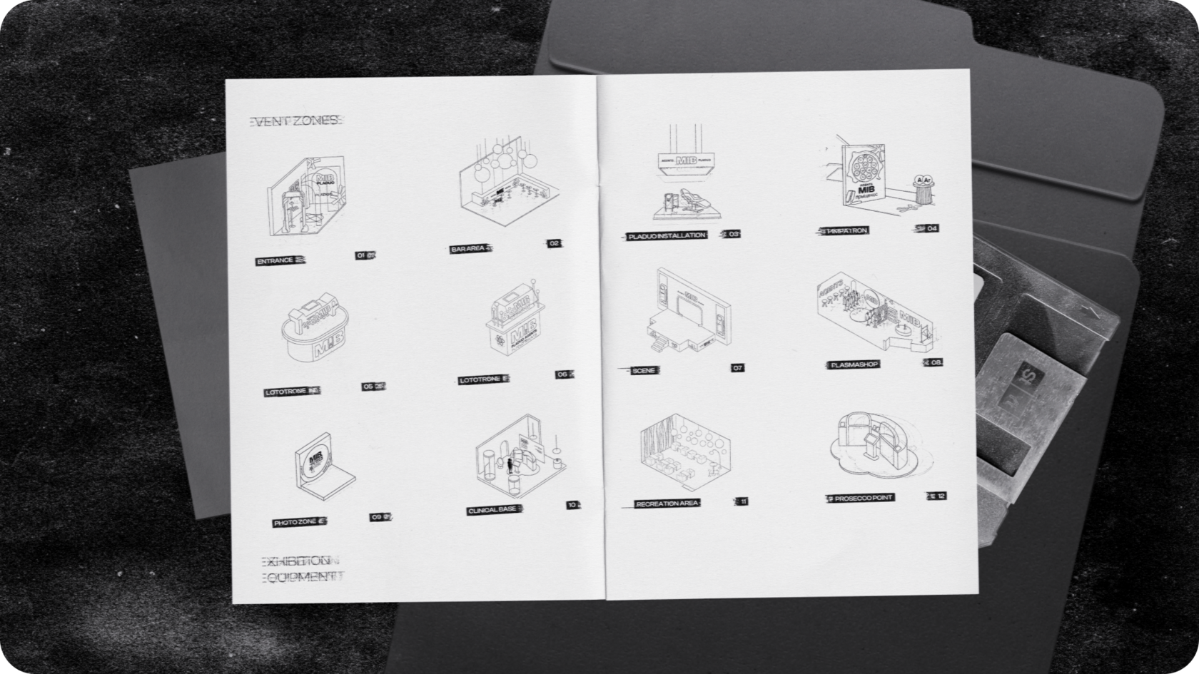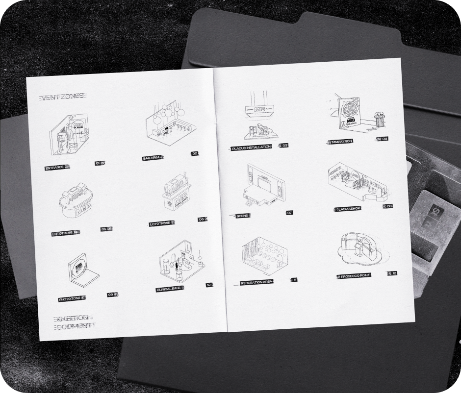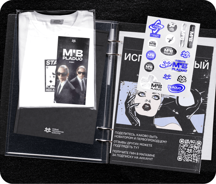 Его цель — создать брендинг и масштабную визуальную концепцию для внутреннего мероприятия. Для этого мы вместе с командой клиента выбрали концепцию «агентов» в духе «Людей в черном», которая объединит архитектуру, графику и продукт в единую иммерсивную систему