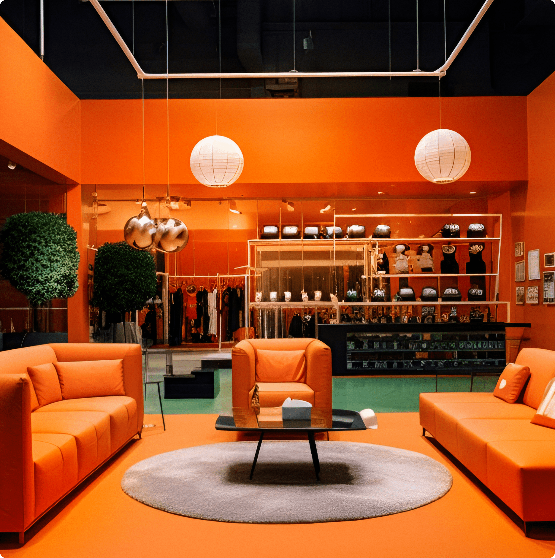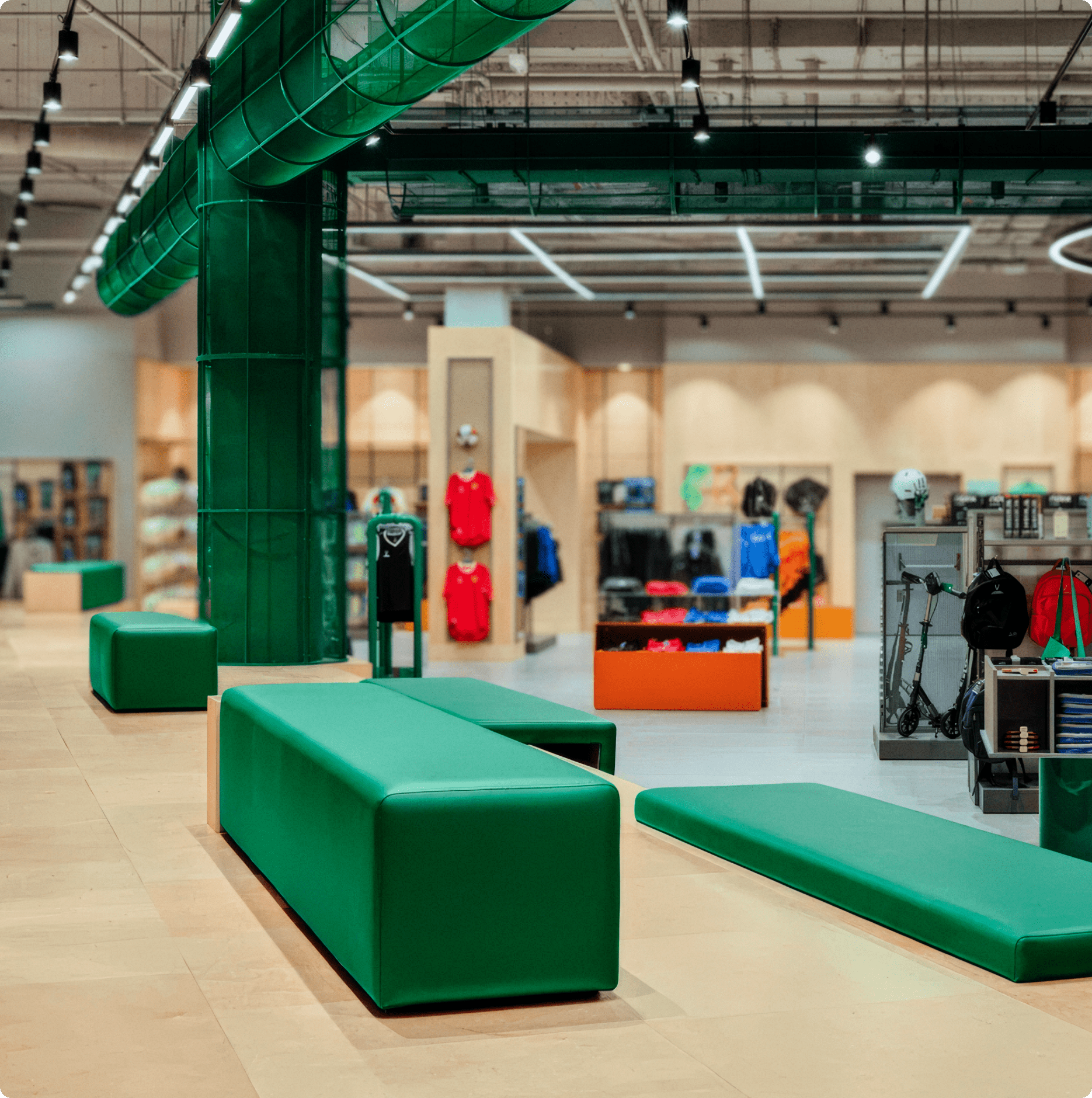 Мы также представили концептуальное решение для элементов средового дизайна — расположения отделов, внутренних помещений сотрудников, коллабораций с брендами. Образно, средовые решения берут своё начало в особенностях настоящего стадиона — это яркие акценты, беговые линии в напольной навигации и спортивная атмосфера.
