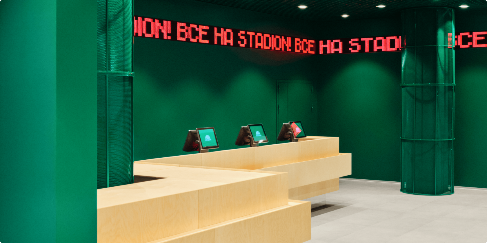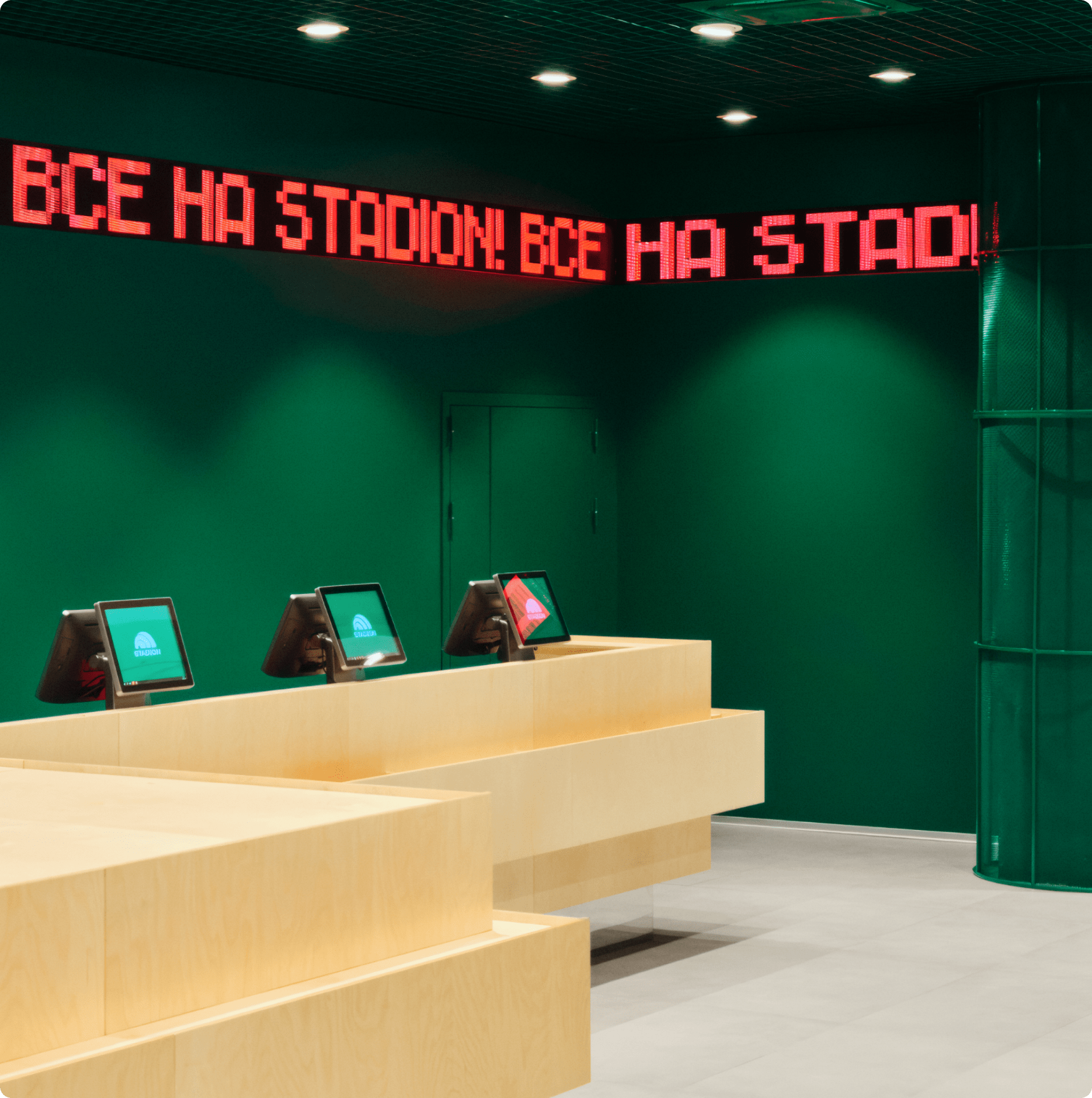 Образно, эти решения отсылают к настоящему стадиону: яркие акценты, беговые линии в навигации и общая спортивная атмосфера создают узнаваемое пространство бренда.