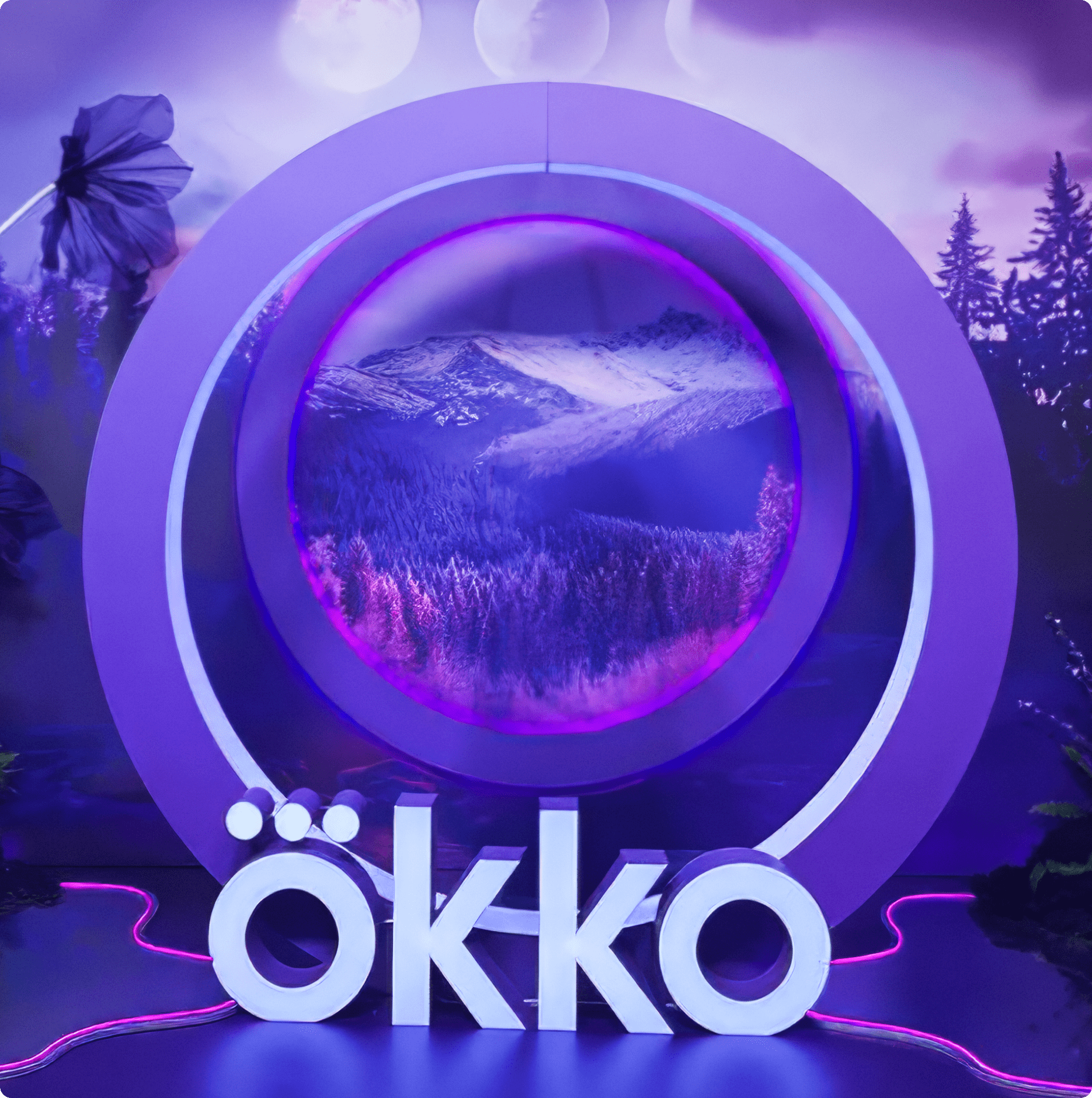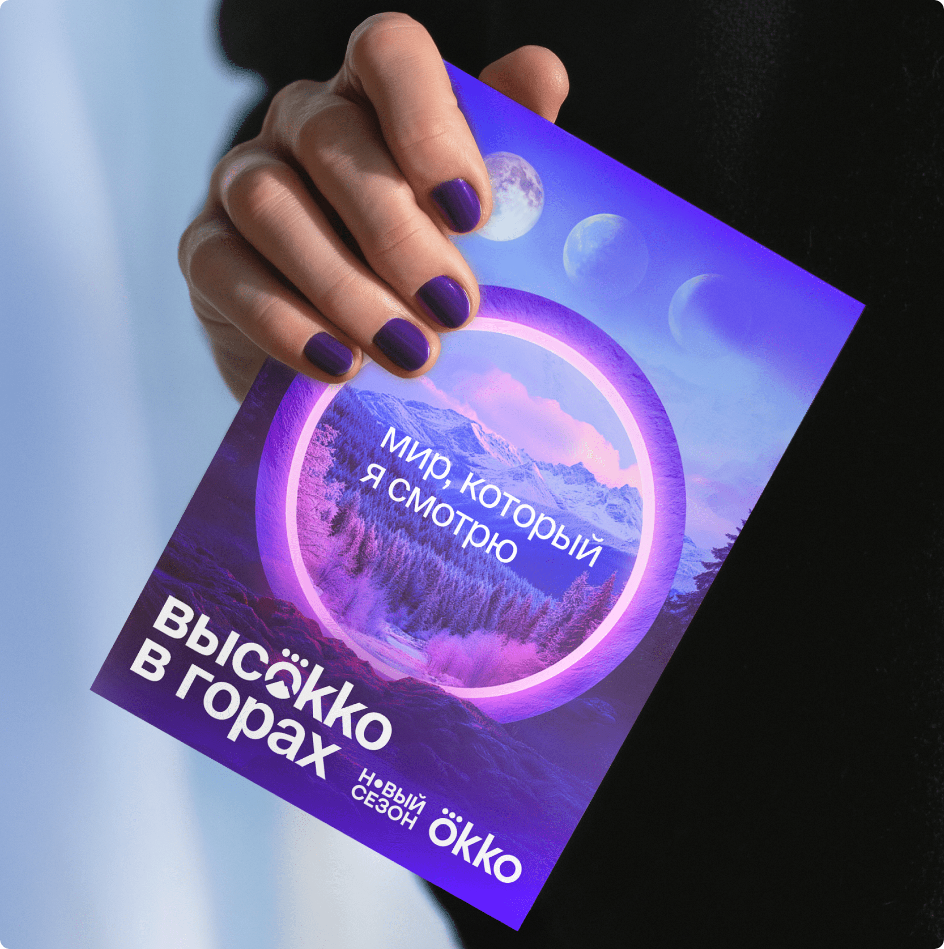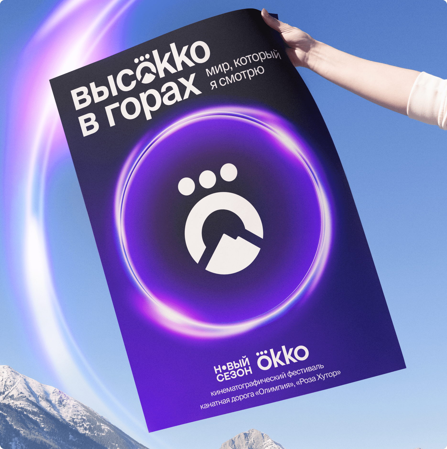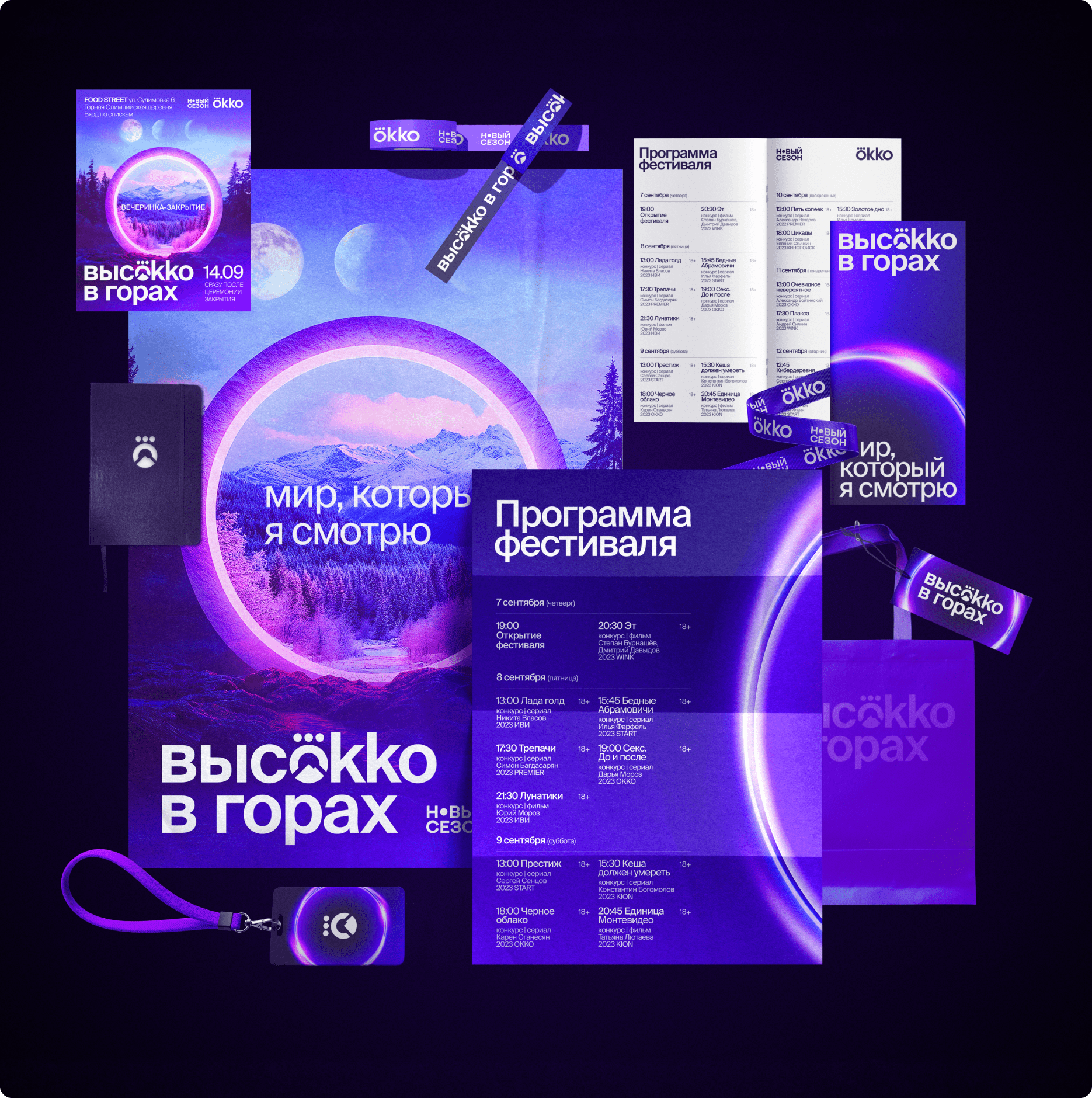 Мы разработали единый брендинг визуальной айдентики для кинофестиваля с красноречивым названием «Вы с Окко в горах». Объединили неизменные компоненты визуальной айдентики Окко — электрический луч и фиолетово‑чёрный градиент, открыв настоящий портал в киномиры.